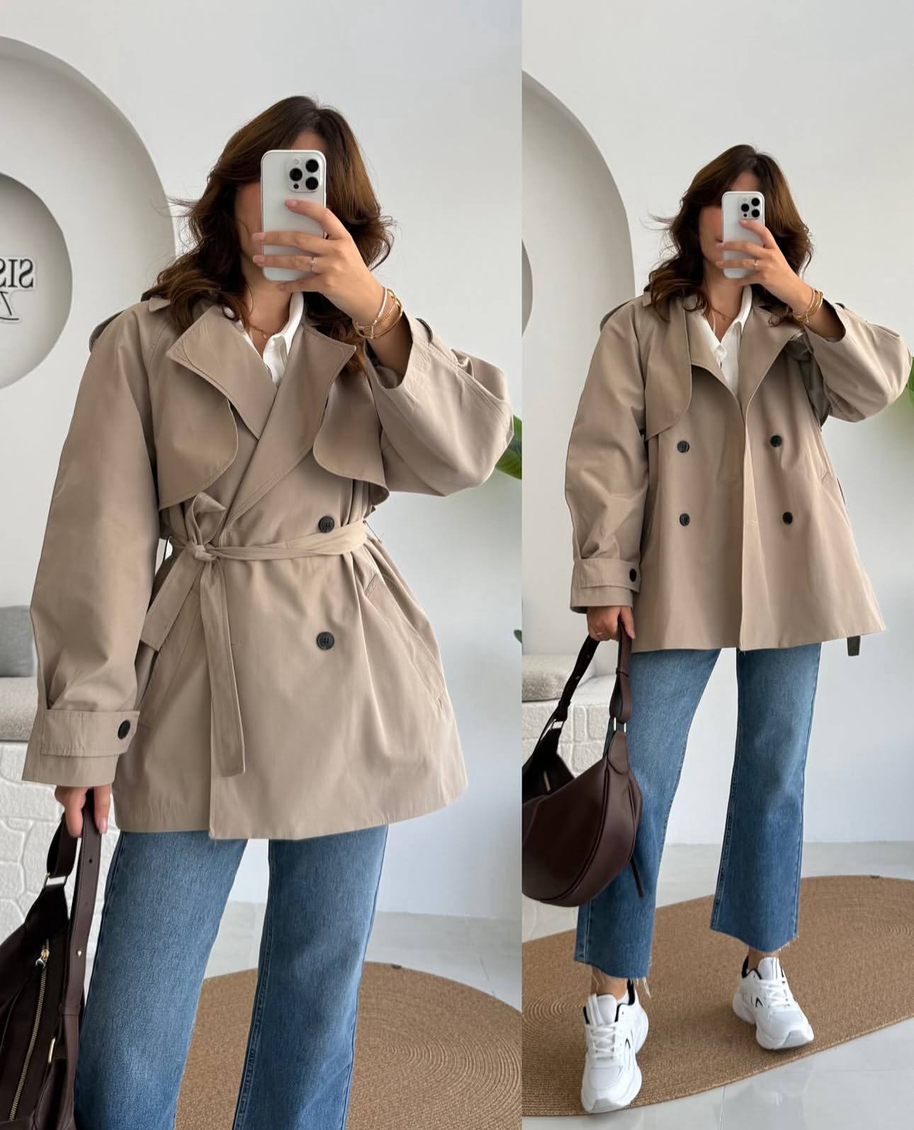 ترنچ کت کوتاه زنانه آستر دار فری سایز مناسب ۳۶ تا ۴۸