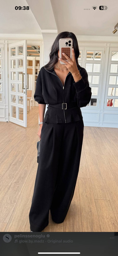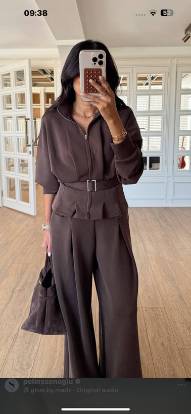 مدل: اویشو (OYSHO Style): هودی زیپدار و شلوار بگ فاق بلند با کمربند